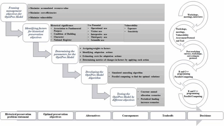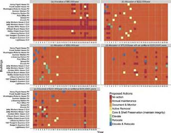 Abstract: Climate change poses great challenges for cultural resource management, particularly in coastal areas. Cultural resources, such as historic buildings, in coastal areas are vulnerable to climate impacts including inundation, deterioration, and destruction from sea-level rise and storm-related flooding and erosion. However, research that assesses the trade-offs between actions for protecting vulnerable and valuable cultural resources under budgetary constraints is limited. This study focused on developing a decision support model for managing historic buildings at Cape Lookout National Seashore. We designed the Optimal Preservation Decision Support (OptiPres) model to: (a) identify optimal, annual adaptation actions for historic buildings across a 30-year planning horizon, (b) quantify trade-offs between different actions and the timing of adaptation actions under constrained budgets, and (c) estimate the effectiveness of budget allocations on the resource value of historic buildings. Our analysis of the model suggests that: (1) funding allocation thresholds may exist for national parks to maintain the historical significance and use potential of historic buildings under climate change, (2) the quantitative assessment of trade-offs among alternative adaptation actions provides generalizable guidance for decision makers about the dynamics of their managed system, and (3) the OptiPres model can identify cost-efficient approaches to allocate funding to maintain the historical value of buildings vulnerable to the effects of climate change. Therefore, the OptiPres model, while not designed as a prescriptive decision tool, allows managers to understand the consequences of proposed adaptation actions. The OptiPres model can guide park managers to make cost-effective climate adaptation decisions for historic buildings more transparently and robustly.