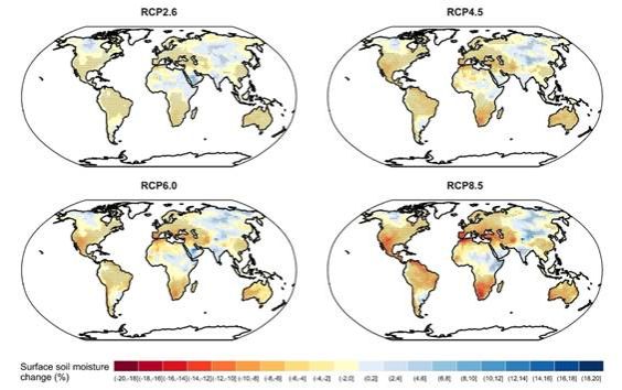 未来气候变化可能改变水文气象模式,并改变全球到区域尺度的干旱性质。然而,未来干旱预测存在相当大的不确定性。本文通过分析CMIP5多模型集合在RCP2.6、RCP4.5、RCP6.0和RCP8.5情景下的表层土壤湿度输出,重点关注农业干旱。首先,到21世纪末,所有情景下的年平均土壤湿度均显示出统计上显著的大范围干旱以及有限的湿润区域,且随着辐射强迫增强,干旱程度加剧。其次,预测显示,在所有区域和所有未来RCP情景下,严重干旱的MME平均空间范围都将扩大,尤其是在中美洲、欧洲及地中海地区、热带南美洲和南非。第三,在内部变率、模型不确定性和情景不确定性这三个不确定性来源中,模型不确定性在整个21世纪是最大的不确定性来源(超过80%)。最后,我们发现,土壤湿度异常的年和季节信噪比的空间格局和量级不随超前时间而发生显著变化,这表明不确定性的范围随着信号的增强而变大。