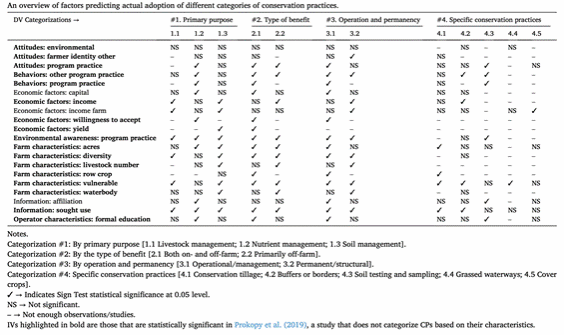 保护性实践对于维持农业生态系统长期生存能力至关重要。由于耕作系统以及农民的价值观和态度具有异质性,能够一致预测保护行为的因素仍然难以确定。此外,不同研究在所考察的保护性实践类型、以及测量的是行为意愿还是实际行为方面也存在异质性。本研究考虑了每种保护性实践的特性,以及特定研究测量的是行为意愿还是实际行为,以期更好地理解农民对保护性实践的采纳。我们回顾并分析了美国35年间(1982-2017年)的定量保护采纳文献。我们根据保护性实践的主要目的、提供的效益类型以及其属于操作性还是结构性实践进行了分类。我们还重点考察了以下五种实践:保护性耕作、缓冲区或边界、土壤测试、植草水道和覆盖作物。在我们的行为意愿和实际行为分析中,我们发现态度因素能同时预测保护意愿和行动(实际行为),而当前或既往的实践使用仅影响行动,不影响陈述的保护意愿。在我们关注保护性实践特性的分析中,我们发现,对特定保护性实践的具体了解和积极态度、采纳其他保护性实践、寻求和使用信息、更大的农场规模以及土地易受损害的特性,几乎在所有保护性实践分类中都能预测实际采纳情况。比较具有特定共同特性的保护性实践的预测因素时,会出现一些细微差别。例如,我们发现农场特征在预测土壤管理类保护性实践的采纳方面比养分和牲畜管理类实践更为重要,而农民的管家身份认同对永久性实践的重要性高于操作性实践。